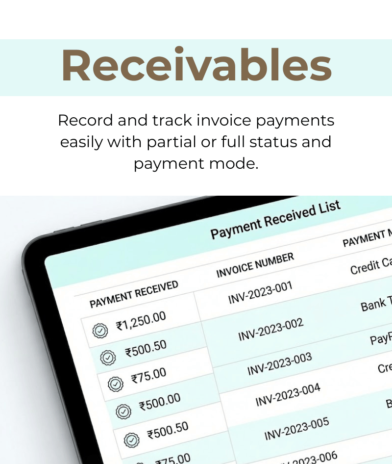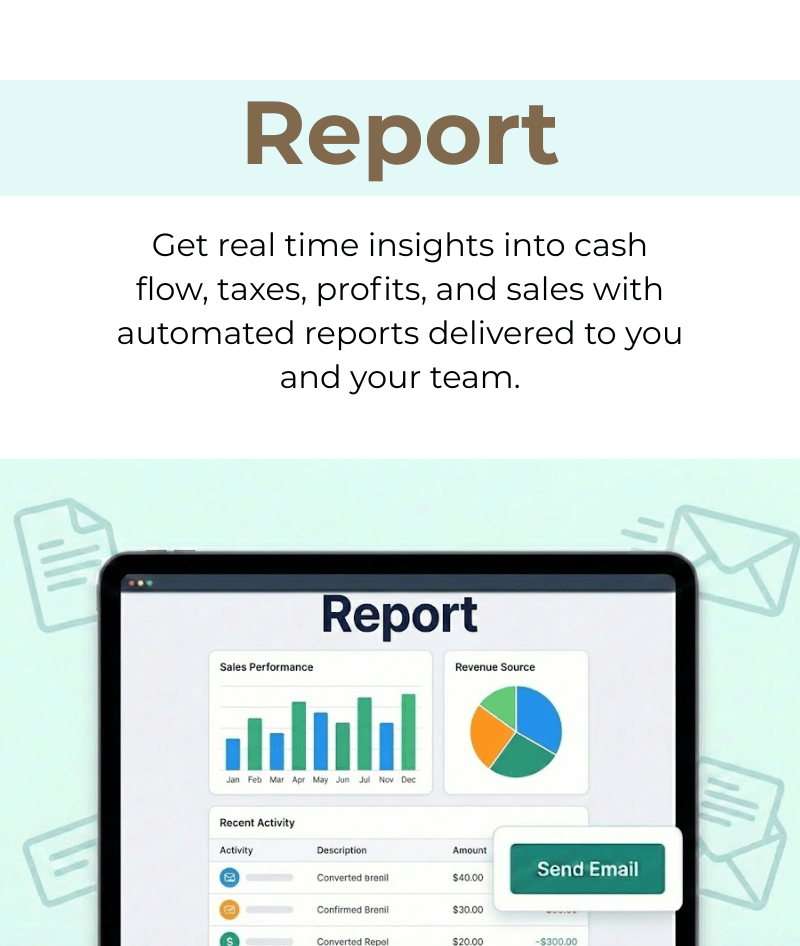 Get real time insights into your business performance with detailed reports on revenue, outstanding payments, top customers, and financial trends.